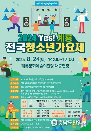 (충남도민일보 / TV / 김천호기자) 계룡시가 ‘2024 Yes! 계룡 전국 청소년가요제’ 참가자를 오는 6월 24일부터 7월 10일까지 모집한다고 밝혔다.