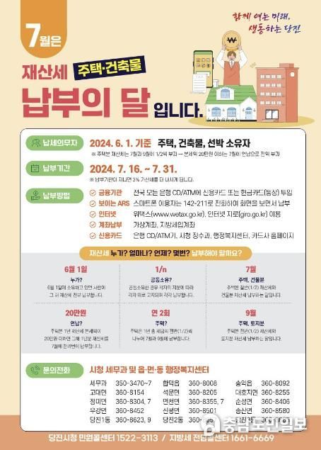 (충남도민일보 / TV / 정연호기자) 당진시는 7월 정기분 재산세 8만 8,000여 건, 308억 원을 부과했다고 밝혔다.