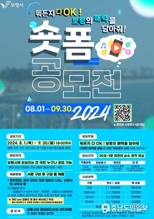 (충남도민일보 / TV / 문성호기자) 보령시는 자연, 관광, 축제 등 보령의 매력을 알릴 수 있는 콘텐츠를 발굴하고자 '뭐든지 다 OK ! 보령의 매력을 담아줘'를 주제로 숏폼 영상 공모전을 개최한다.