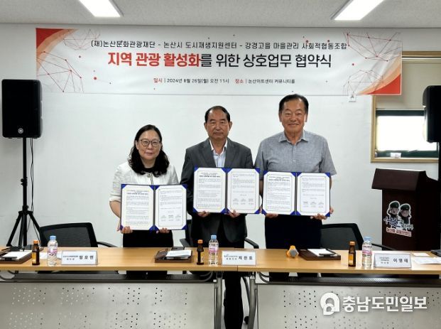 (충남도민일보(도민방송) 정연호기자) (재)논산문화관광재단과 논산시 도시재생지원센터 강경고을 마을관리 사회적협동조합이 관광사업의 운영·관리, 관광마케팅 등 지역의 관광 활성화 및 논산시 도시재생사업의 상호발전을 위한 업무협약을 체결했다.