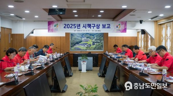 (충남도민일보(도민방송) 김천호기자) 금산군은 12일 군청 상황실에서 2025년 시책구상 보고회를 열고 내년 세계로・미래 사업 발굴을 위한 총력 대응에 나섰다.