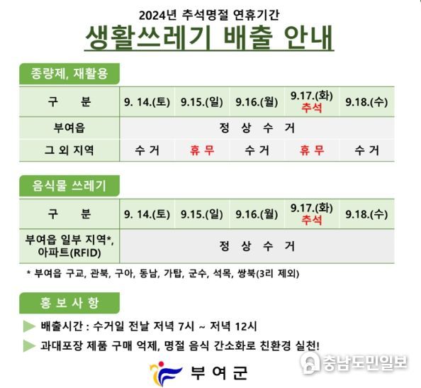 한편, 부여군은 추석 연휴 기간 환경상황반과 기동처리반을 운영하여 생활쓰레기로 인한 민원에 신속 대응하여 주민 불편을 최소화할 수 있도록 조치할 계획이다.