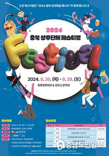 (충남도민일보(도민방송) 정호영기자) 2024 충북 상주단체 페스티벌이 증평문화회관에서 오는 9월 26일부터 28일까지 3일간 열린다.