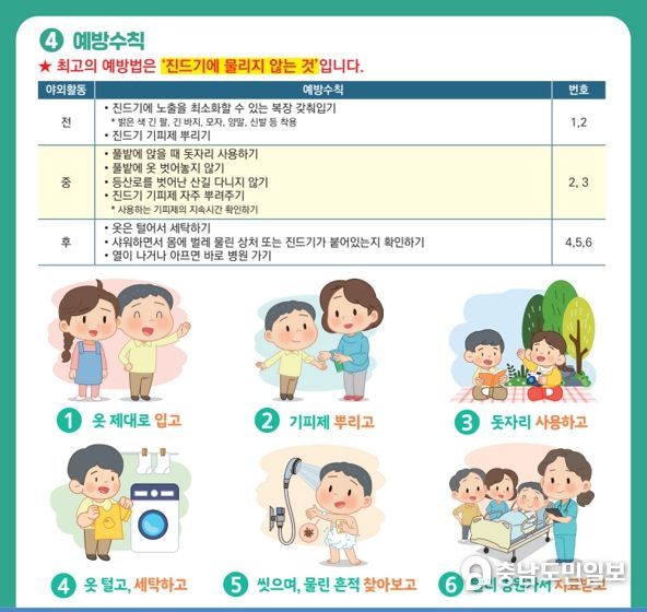 진드기에게 물리지 않으려면 ▲야외활동 시 긴 옷을 입어 피부 노출을 최소화하고 ▲풀밭 위에 앉거나 눕지 않도록 주의해야 한다. 또한 ▲진드기를 발견하기 쉽도록 밝은색 옷을 착용하고 ▲풀베기 작업 후에는 목욕하기, 옷 갈아입기 등 예방수칙을 준수해야 한다.