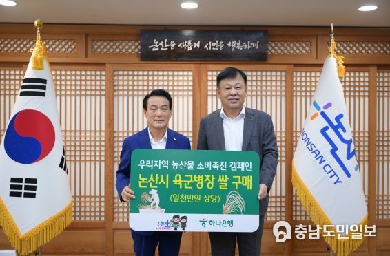 (충남도민일보(도민방송) 이상각기자) 백성현 논산시장과 김세용 하나은행 충남북지역대표가 26일 만나 논산시 농산물공동브랜드‘육군병장’ 홍보에 힘을 모을 것을 약속했다.
