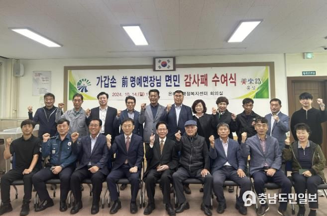 (충남도민일보(도민방송) 정연호기자) 은하면은 14일 은하면행정복지센터 2층 회의실에서 은하면 기관단체장, 주민, 공무원 등 40여 명이 참석한 가운데, 그동안 고향인 은하면 발전을 위해 많은 기여를 해온 가갑손 전 명예면장에게 면민감사패를 수여했다.