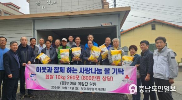 (충남도민일보(도민방송) 임경희기자) 부여군 부여읍이장단(회장 이광열)은 지난 14일 사랑의 쌀 260포(10kg, 시가 800만 원)를 지역 내 어려운 이웃들에게 전달했다.