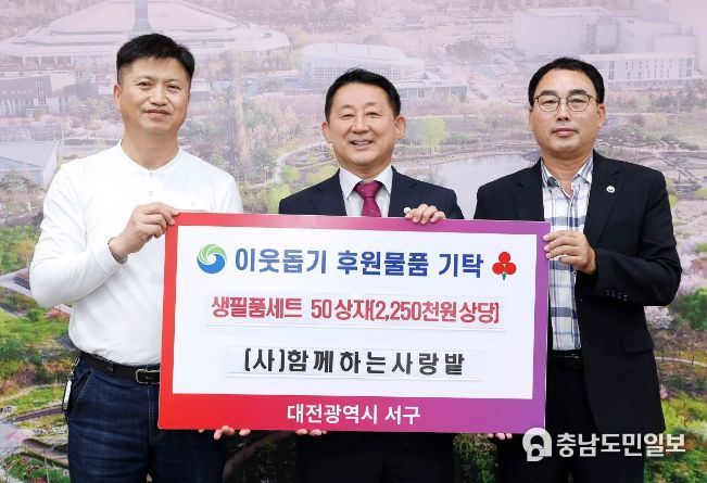 (충남도민일보(도민방송) 김천호기자) 대전 서구는 지난 16일 갑천누리실에서 사단법인 함께하는사랑밭으로부터 저소득가정 지원을 위한 생필품 세트 50상자(225만 원 상당)를 전달받았다.