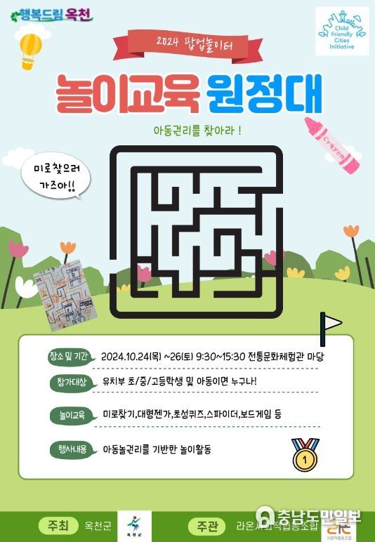 (충남도민일보(도민방송) 김천호기자) 충북 옥천군이 24 부터 26일 옥천전통문화체험관 놀이마당 일원에서 2024년 찾아가는 팝업놀이터 ‘놀이교육원정대-아동권리를 찾아라’를 운영한다.