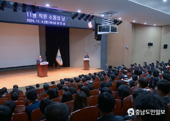 (충남도민일보(도민방송) 정연호기자) 최민호 세종특별자치시장이 4일 시청 여민실에서 열린 11월 직원 소통의 날에 참석해 전국적으로 재정이 어려운 상황이지만 도시의 미래를 위한 사업은 반드시 해내야 한다고 역설했다.