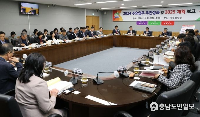 (충남도민일보(도민방송) 김천호기자) 계룡시 는 지난 11일 시청 상황실에서 이응우 시장을 비롯한 관계 공직자 50여 명이 참석한 가운데 ‘2024년도 주요업무 추진성과 및 2025년도 업무계획 보고회’를 열었다고 밝혔다.