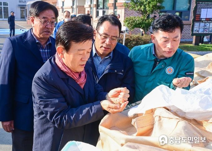 (충남도민일보(도민방송) 정연호기자) 조규일 진주시장은 12일 이반성면 삼거마을 공공비축미곡 건조벼 첫 매입 현장을 방문해 출하 농업인을 격려했다.