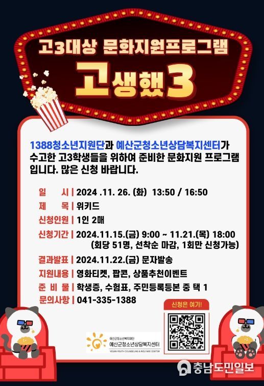 (충남도민일보(도민방송) 정연호기자) 예산군청소년상담복지센터는 오는 26일 1388청소년지원단과 함께 예산시네마에서 관내 고등학교 3학년 청소년 대상으로 영화관람을 지원한다.