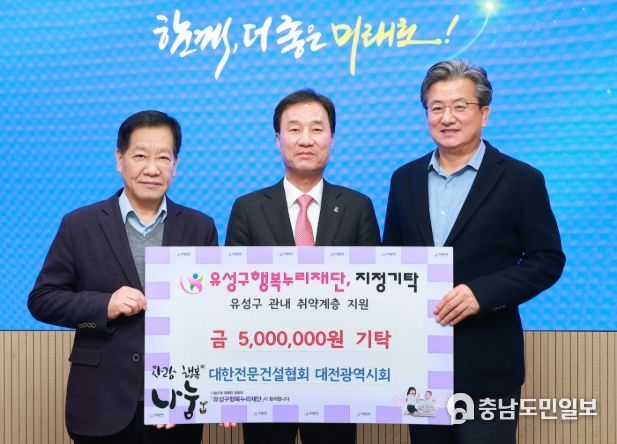 (충남도민일보(도민방송) 김천호기자) 대전 유성구는 27일 대한전문건설협회 대전광역시회(회장 윤태연)가 저소득층을 위해 후원금 500만원을 기탁했다고 밝혔다.