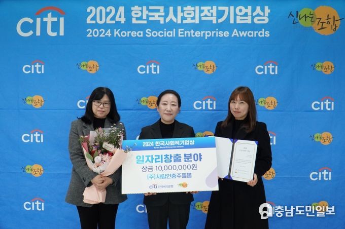 (충남도민일보(도민방송) 정연호기자) 사회적기업 (주)사람인충주돌봄이 2024 한국 사회적기업상 취약계층 일자리 창출 부문의 수상기업으로 선정되어 1,000만 원의 상금을 받았다.