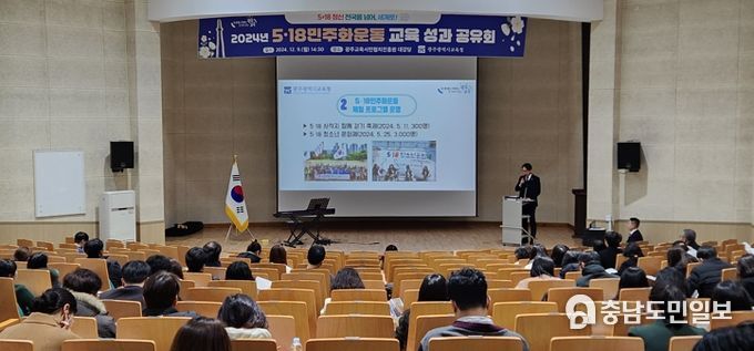 (충남도민일보(도민방송) 이주상 기자) 광주시교육청이 9일 광주교육시민협치진흥원 대강당에서 5·18민주화운동 교육 담당 초·중·고 교원 200여 명이 참석한 가운데 ‘2024년 5·18민주화운동 교육 성과 공유회’를 성공적으로 운영했다.