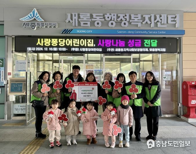 (충남도민일보(도민방송) 정연호기자) 세종특별자치시 새롬동 사랑퐁당어린이집(원장 정미연)이 16일 새롬동지역사회보장협의체(공동위원장 김지원·강신우)에 아나바다 수익금 30만 원을 기부했다.