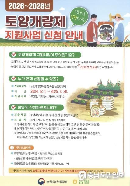(충남도민일보(도민방송) 임경희기자) 단양군은 2월 20일까지 ‘2026∼2028년 토양개량제 지원사업’을 접수받는다고 밝혔다.