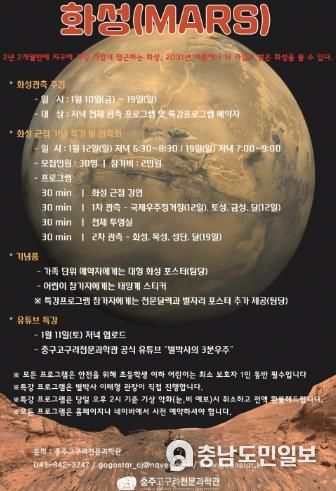 (충남도민일보(도민방송) 정연호기자) 충주고구려천문과학관에서는 1월 10일부터 19일까지 10일 동안 가장 밝아진 화성 관측 행사를 실시한다.