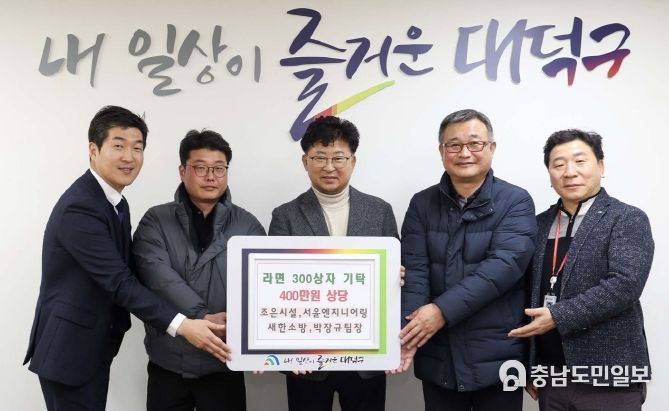 (충남도민일보(도민방송) 김천호기자) 대전 대덕구는 조은시설, 새한소방, 서윤엔지니어링, 박장규 대덕구 공동주택과 팀장으로부터 지역의 어려운 이웃을 위한 400만원 상당의 라면을 기탁받았다고 4일 밝혔다.