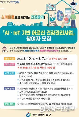 (충남도민일보(도민방송) 이주상 기자) 광주 동구는 오는 10일부터 AI(인공지능)·IoT(사물인터넷) 기반 어르신 건강 관리 사업 대상자를 선착순 모집한다고 밝혔다.