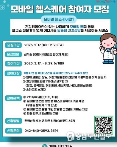 (충남도민일보(도민방송) 김천호기자) 계룡시가 오는 17일부터 28일까지 주민 스스로 건강을 관리할 수 있도록 하는 ‘모바일 헬스케어’ 사업 참여자 50명을 모집한다고 밝혔다.