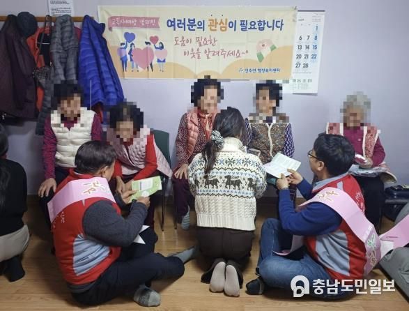 (충남도민일보(도민방송) 정연호기자) 아산시 인주면 행복키움추진단이 지난 18일 문방1리 경로당에서 주민들을 대상으로 복지사각지대 발굴 및 고독사 예방을 위한 홍보 캠페인을 진행했다.