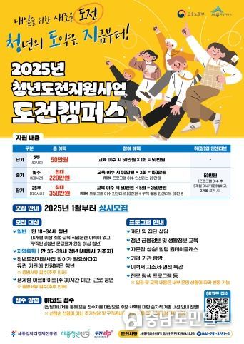 (충남도민일보(도민방송) 정연호기자) 세종일자리경제진흥원이 운영하는 세종청년센터가 장기 미취업 청년들의 사회진입을 지원하기 위한 ‘청년도전지원사업’ 참여자를 모집한다.
