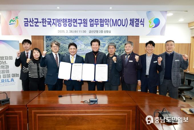 (충남도민일보(도민방송) 김천호기자) 금산군과 한국지방행정연구원은 지난 26일 금산군청에서 박범인 금산군수, 육동일 한국지방행정연구원장을 비롯한 임직원들이 참석한 가운데 업무협약을 체결했다.