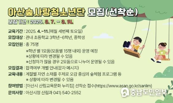 (충남도민일보(도민방송) 정연호기자) 아산시가 새 학기를 맞아 2025년 '아산숲사랑청소년단' 모집을 시작한다.