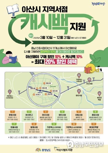 (충남도민일보(도민방송) 정연호기자) 아산시가 지역서점 활성화와 독서문화 확대를 위해 10일부터 ‘2025년 지역서점 캐시백 지원사업’을 시행한다.