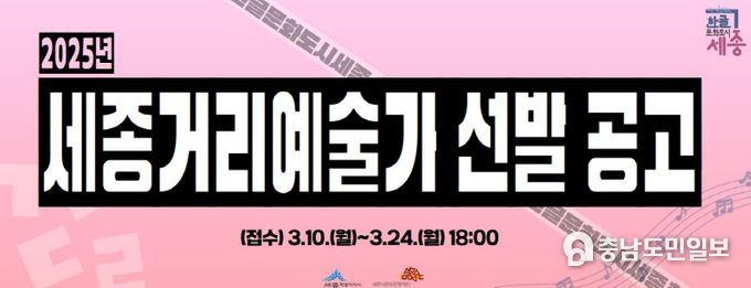 (충남도민일보(도민방송) 정연호기자) 세종시문화관광재단은 2025 찾아가는 세종 한글 컬처로드와 함께할 세종거리예술가 30팀을 선발한다.