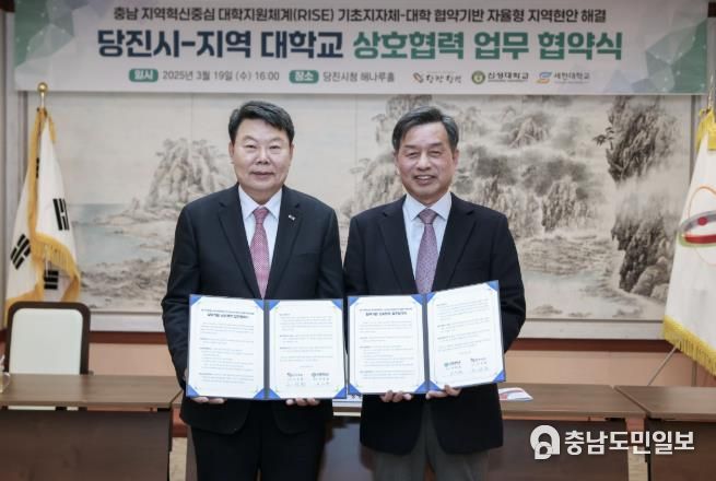 (충남도민일보(도민방송) 문성호기자) 당진시는 19일 당진시청 내 해나루홀에서 신성대학교 및 세한대학교와 지역 현안 해결 추진을 위한 ‘지역혁신중심 대학지원체계(RISE)' 업무협약식을 진행했다고 20일 밝혔다.