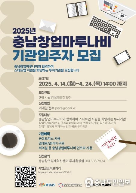 (충남도민일보(도민방송) 정연호기자) 충남창조경제혁신센터는 이달 24일까지 2025년 충남창업마루나비 기관입주자를 모집한다고 밝혔다.
