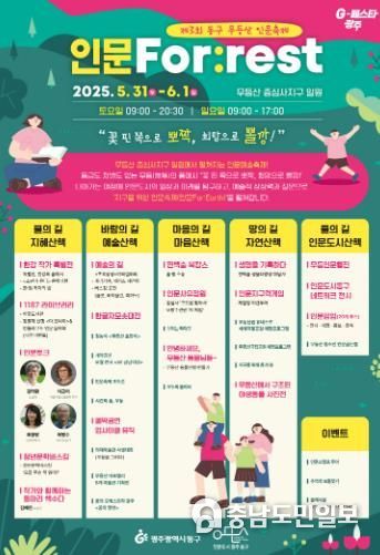 (충남도민일보(도민방송) 이주상 기자) 광주 동구가 오는 5월 31일과 6월 1일 이틀간 무등산 증심사 지구 일원에서 ‘제3회 동구 무등산 인문축제’ '인문For:rest'를 개최한다고 밝혔다.