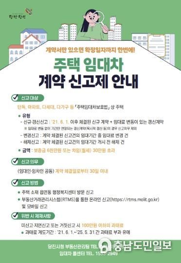 (충남도민일보(도민방송) 문성호기자) 당진시는 시행된 ‘주택 임대차 계약 신고제’의 계도기간이 오는 5월 31일로 종료됨에 따라 6월부터 신고 미이행 시 과태료를 부과한다고 8일 밝혔다.