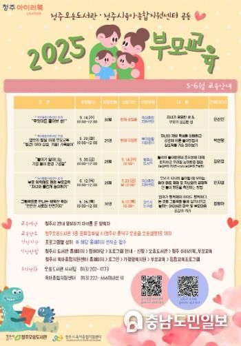 (충남도민일보(도민방송) 정연호기자) 청주오송도서관은 영유아 가정의 건강한 성장을 위해 다양한 육아정보를 제공하는 2025년 ‘청주 아이러북’ 부모교육을 운영한다.