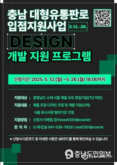(충남도민일보(도민방송) 정연호기자) 충남창조경제혁신센터는 ‘2025년 충남 대형유통판로 입점지원사업’ 디자인 개발 지원 프로그램에 참여할 창업기업을 5월 12일부터 26일까지 모집한다고 밝혔다.