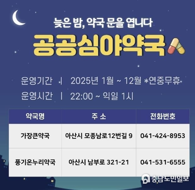올해 지정된 공공심야약국은 △가장큰약국(아산시 모종남로12번길 9) △풍기온누리약국(아산시 남부로 321-21) 총 2개소로, 밤 10시부터 익일 오전 1시까지 운영된다. 또한, 주말과 공휴일, 명절에도 운영되어 언제든지 의약품 구매가 가능하다.