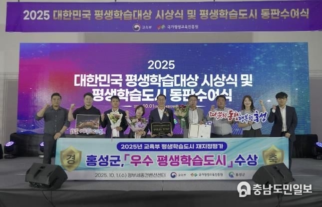 (충남도민일보 =홍성/ 정연호기자) 홍성군은 지난 1일 정부세종컨벤션센터에서 열린 ‘2025 대한민국 평생학습대상 및 평생학습도시 동판수여식’에서 교육부장관 기관표창을 수상하며, 전국 평생학습 활성화를 선도하는 도시로 위상을 높였다.