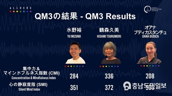 챌린지 참가자인 오아나 부디카스탄쿠(Oana Budicastancu), 츠루모리 히사미(Hisami Tsurumori), 미즈노 유(Yu Mizuno)씨 중 츠루모리씨가 가장 높은 QM3™ 점수를 기록했다. 그녀는 "20년 전 질병에 걸린 일을 계기로 명상을 시작한 뒤 매일 수행해왔다"면서 "삶에서 스트레스와 불안을 느끼는 분에게 명상이 내게 그랬듯 내적 평화를 가져다주길 바란다"고 전했다.