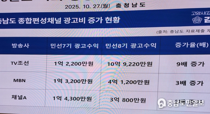 (충남도민일보(도민방송) 관리자)김태흠 충남지사 취임 이후 충청남도의 광고비 집행 내역이 국회 국정감사에서 도마 위에 올랐다. 특히, TV조선을 비롯한 특정 보수 성향 종합편성채널(종편)에 대한 광고비 지출이 민선 7기 때보다 최대 9배 이상 급증한 것으로 드러나, 도민의 세금으로 운영되는 도정 홍보 예산의 집행이 편향되고 불투명하다는 비판이 강하게 제기됐다.