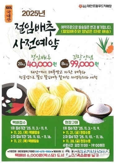 11월 9일 1차 접수가 마감돼 20일 일괄 택배 발송되며, 2차 접수는 11월 16일 마감돼 27일 발송된다. 직접 수령하고자 하는 구매자는 사전 예약 후 21일(1차 접수자)과 28일(2차 접수자) 태안로컬푸드직매장(남면 안면대로 1641)을 방문하면 된다. 수령시간은 오전 11시부터 오후 7시까지다.