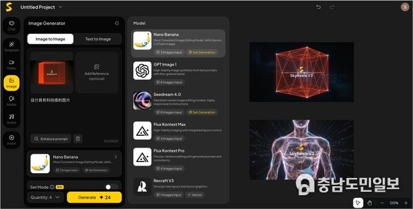 이번에 업그레이드된 스카이릴스에서는 모든 AI 기능과 세계 최고의 AI 모델이 단일 창작 작업 공간에 완벽하게 통합되었다. 하나의 캔버스가 통합형 AI 도구 역할을 하여 이미지, 동영상, 음악, 기타 멀티모달 콘텐츠를 손쉽게 병합할 수 있다.