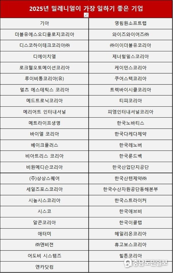 이번 '대한민국 밀레니얼이 가장 일하기 좋은 기업'에 선정된 기업들은 아래와 같다.
