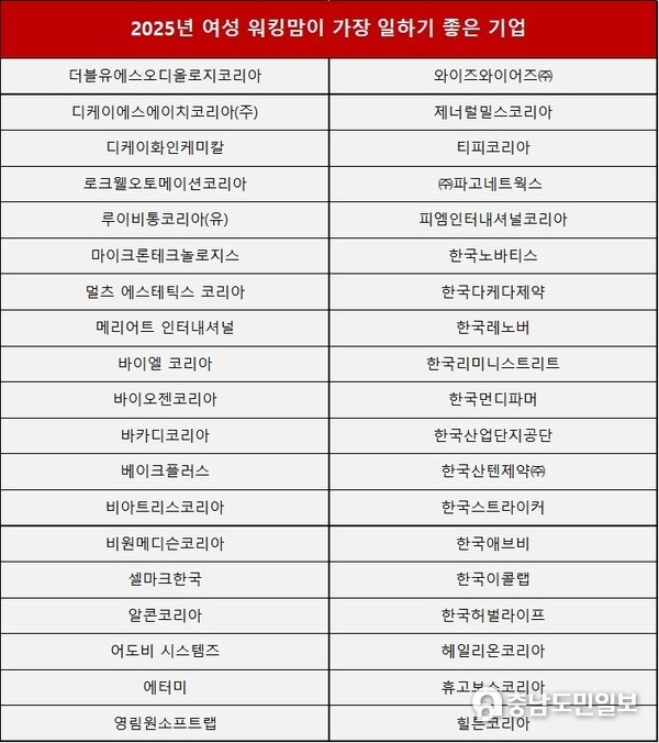 2025년 대한민국 여성 워킹맘이 일하기 좋은 기업에 선정된 기업들은 여성 워킹맘이 일하기 좋은 조직문화와 제도를 조성해 왔으며, 이를 통해 기업의 생산성과 직원의 만족도를 높이는 데 성공했다. 이번 '2025년 대한민국 여성 워킹맘이 일하기 좋은 기업'에 선정된 기업들은 아래와 같다.