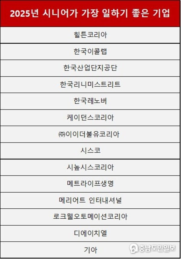 2025년 선정된 기업들은 시니어 직원들을 배려한 정책과 프로그램으로 조직 내 신뢰와 존중 문화를 형성했다는 점에서 높은 평가를 받았다. '2025년 대한민국 시니어가 가장 일하기 좋은 기업은 다음과 같다.