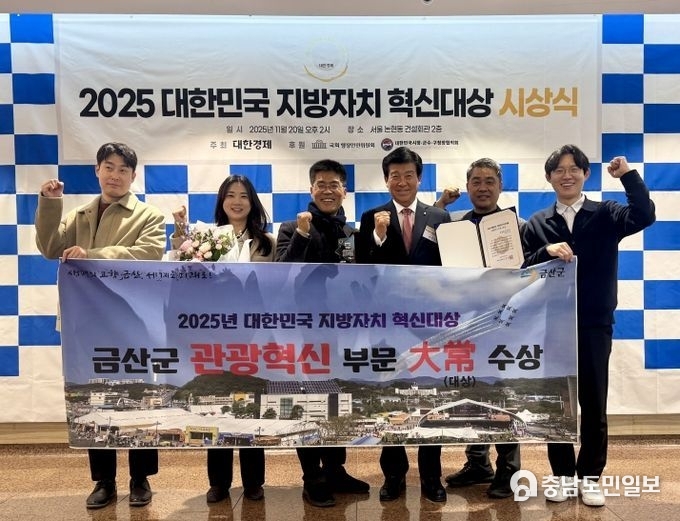 (충남도민일보=금산) 정연호기자/ 금산군은 20일 서울시 강남구 논현동 건설회관에서 열린 2025 대한민국 지방자치 혁신대상 시상식에서 관광혁신부문 대상을 받았다.