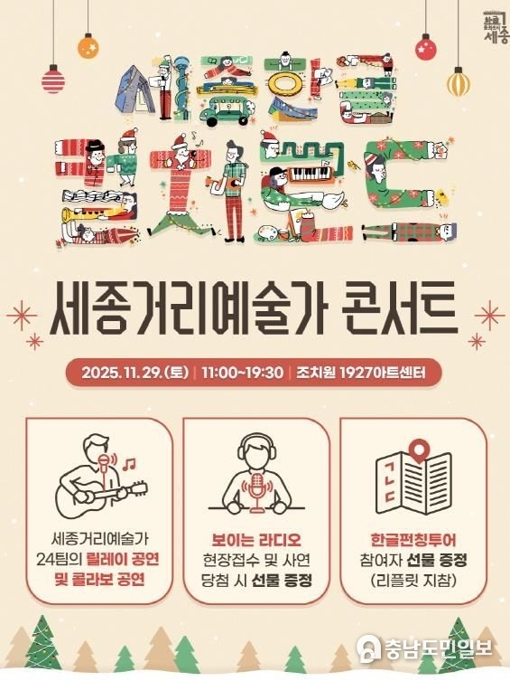 (충남도민일보 =세종) 정연호기자/ 세종시문화관광재단은 오는 11월 29일 오전 11시, 조치원읍 1927아트센터에서 ‘세종거리예술가 콘서트’를 개최한다.