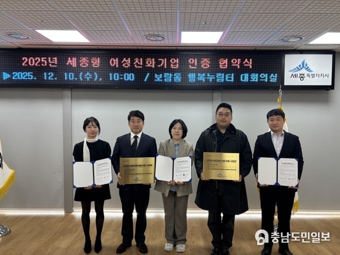 (충남도민일보=세종) 정연호기자/ 세종특별자치시가 10일 보람동 행복누림터 대회의실에서 ‘2025년 세종형 여성친화기업’ 인증 협약식을 개최했다.